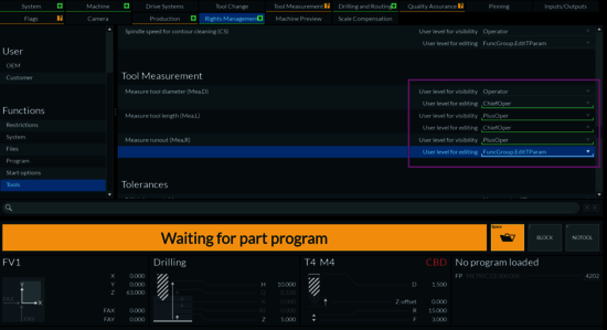 The comprehensive rights management is located in the Configurator. Here you can configure user levels for the general access to the CNC control. These access permissions govern the user interface content and functionality available to each user. For each individual CNC command, a user level and specifically a user lever during execution can be set. In "Program" you can set the user level for visibility and editability of specific functions such as for example for Free Selection or for pinning. This also applies for all tool functions, as for example tool measurement, contour cleaning and diameter tables.