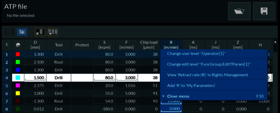 Individual columns of the tool tables can also be enabled or restricted for different user level via a right-click dialog box. For example, the user and the edit level of the retract rate can be adjusted in the parameter table. It is also possible to jump to the rights management in the Configurator from these columns.