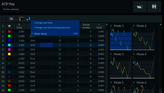 User levels can now be quickly and directly adjusted on the buttons with clear functions on tool pages. A right-click dialog box on the buttons provides access to the options „Change user level“ and „Change user level during execution“. In this way, action can be taken very quickly during the production. The risk of data from ATP files being accidentally deleted is reduced, for example the diameter table or the static tool parameters. The buttons with clear functions are easily recognizable by their orange border. They are located on the function bars directly above of the tables.